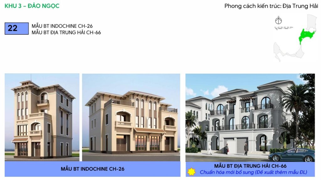 • Liền kề Đảo Ngọc: Các căn này có diện tích linh hoạt từ 60-120m², thiết kế tối ưu với sân vườn mini và gara riêng. Chúng lý tưởng cho gia đình trẻ, với giá bán dự kiến từ 5-9 tỷ đồng, tùy vị trí gần biển hay công viên. Sáng tạo trong thiết kế, một số căn tích hợp không gian làm việc tại nhà (work-from-home), đáp ứng nhu cầu hybrid working ngày nay.