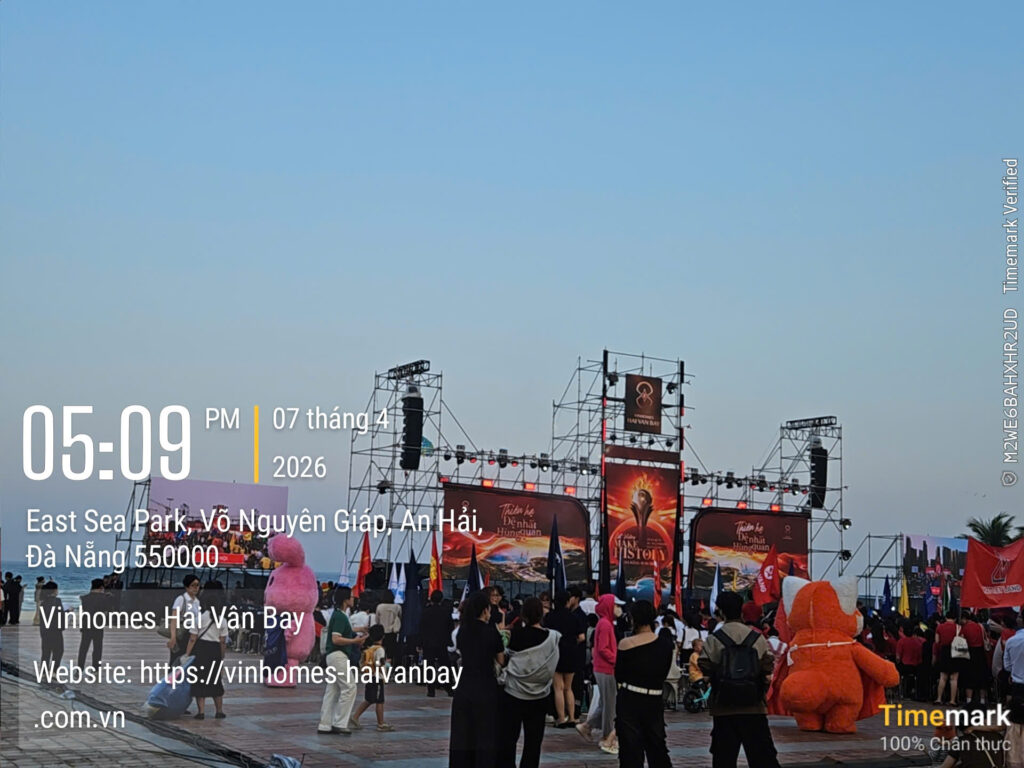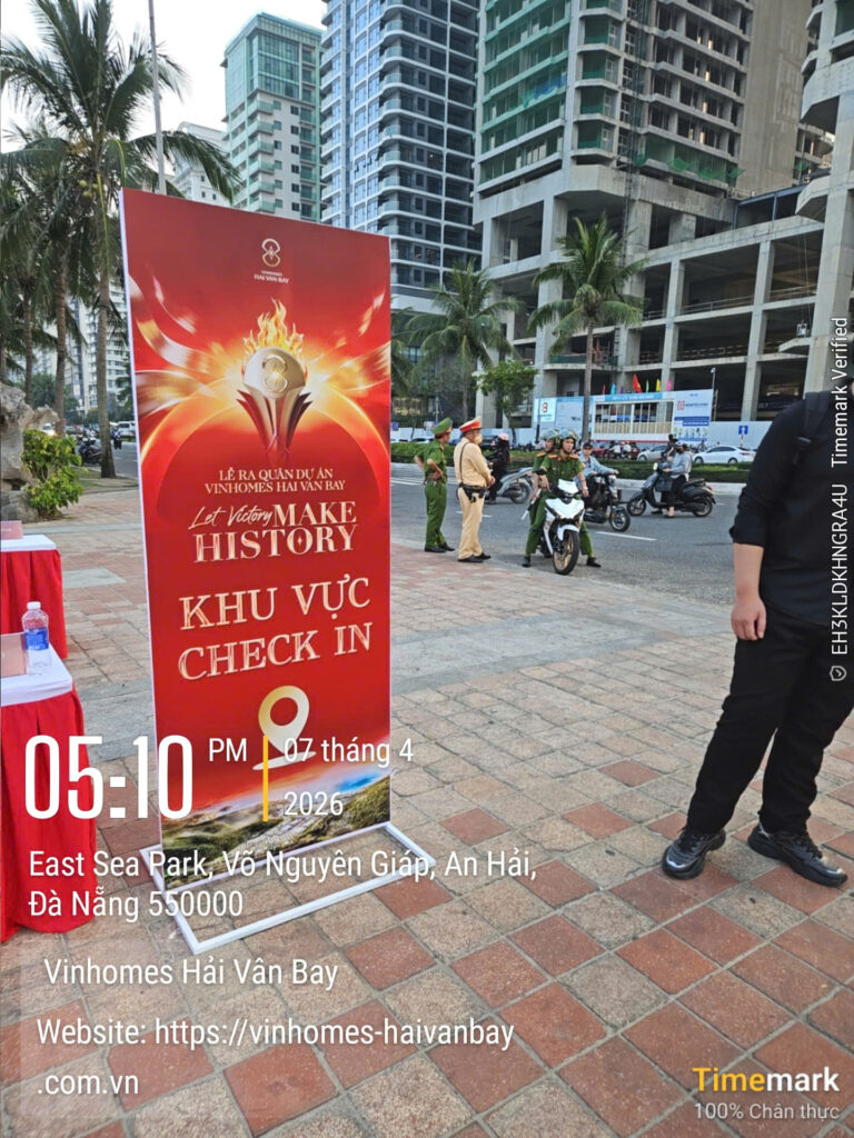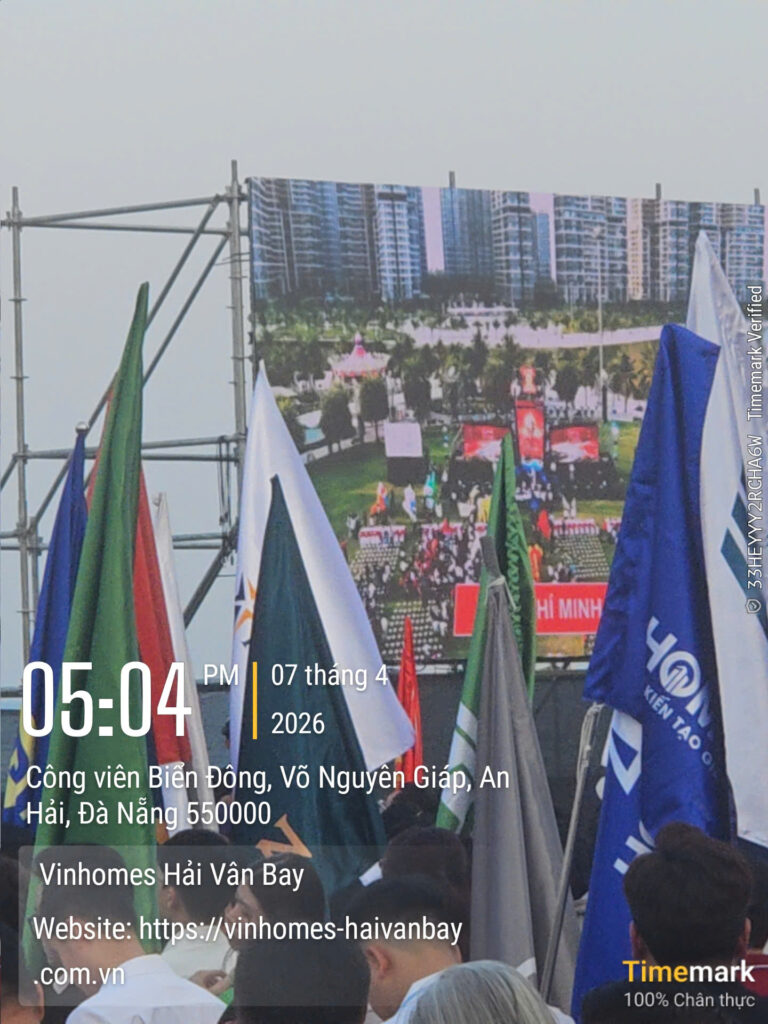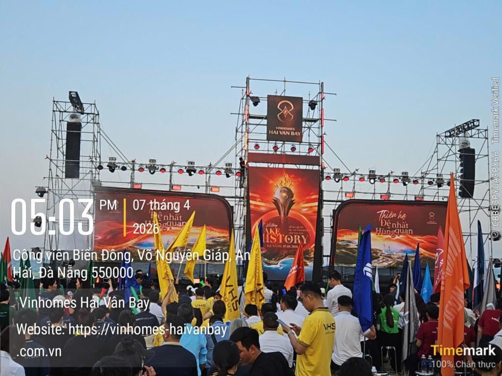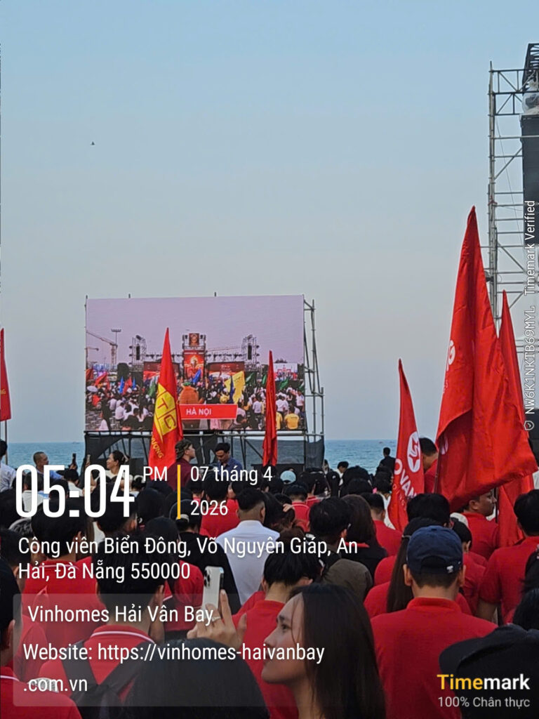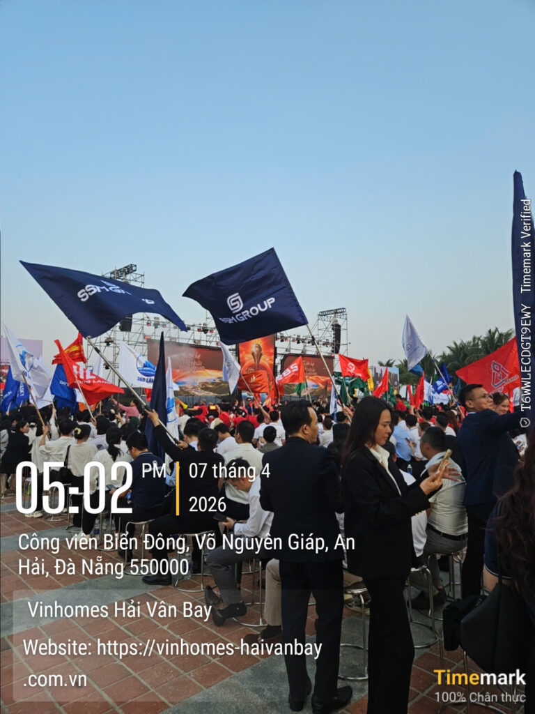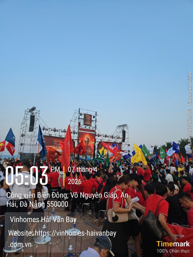 Ngày 07 tháng 4 năm 2026, tại ba điểm cầu Hà Nội – Đà Nẵng – TP.HCM, một sự kiện bất động sản mang tầm vóc lịch sử đã chính thức diễn ra theo hình thức cầu truyền hình trực tiếp. Với chủ đề “Let Victory Make History”, Lễ Ra Quân & Kick-off Vinhomes Hải Vân Bay quy tụ hơn 5.000 “chiến binh sale” từ toàn bộ 46 đại lý chiến lược và liên minh phân phối khắp ba miền. Không khí bùng nổ như một lễ hội biển thực thụ: cờ đỏ bay phấp phới trong gió biển, sân khấu hoành tráng rực rỡ ánh sáng laser, tiếng vỗ tay vang vọng hòa quyện cùng tiếng sóng vỗ, và những chiếc roll-up đỏ rực với biểu tượng ngọn lửa vàng cùng dòng chữ “Let Victory Make History” nổi bật giữa không gian xanh ngắt.