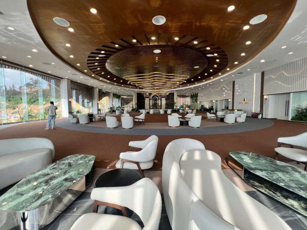 Không gian lounge trung tâm hình vòng cung rộng lớn, với ghế ngồi êm ái bố trí hài hòa, khu vực tiếp khách thoải mái, và backdrop màn hình LED lớn trưng bày hình ảnh dự án. Trần nhà được ốp gỗ nâu ấm áp xen kẽ họa tiết sóng nước kim loại vàng, tạo cảm giác như đang ở trong một resort 5 sao ven biển thực thụ.